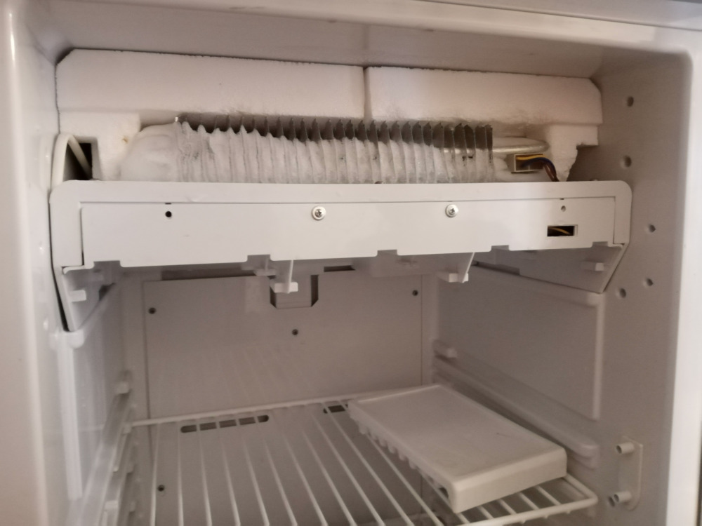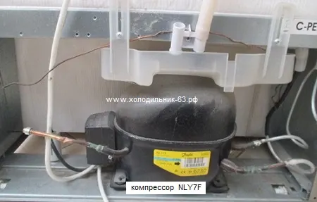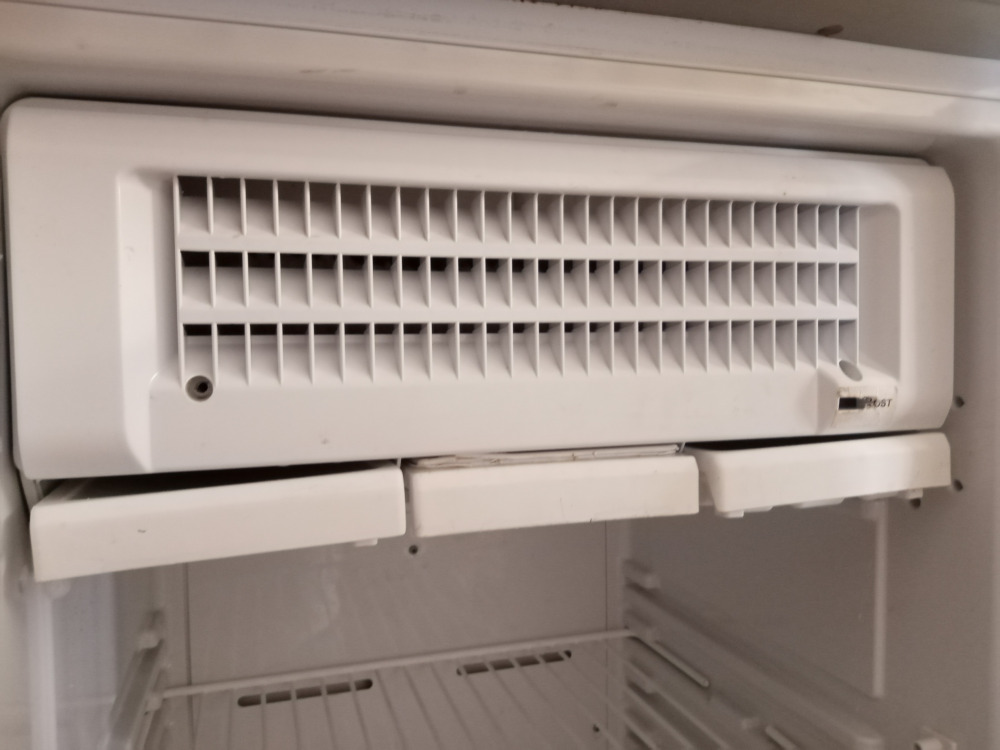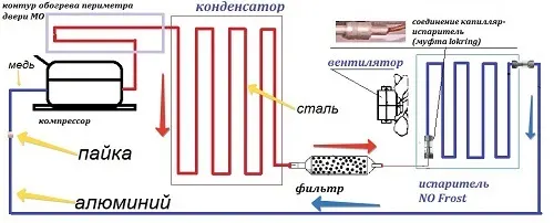 алюминиевый испаритель, и располагается в верху морозильной камеры. За испарителем устанавливается вентилятор, который прогоняет воздух через испаритель. При прохождении через испаритель воздух охлаждается и направляется на продукты. Температура в камере регулируется терморегулятором прямого метода измерения . Терморегулятор фиксирует непосредственно температуру воздуха и располагается на задней стенке камеры, в средней ее части. Влага, содержащаяся в морозильной камере, вымерзает на испарителе. Для сохранения эффективности охлаждения воздуха из-за низкой теплопроводности слоя инея, необходимо время от времени производить оттайку испарителя. Оттайка начинается по команде таймера системы «No Frost» и происходит под действием тепла, вырабатываемого тэном поддона каплепадения. В состав системы входит таймер, испаритель, вентилятор, тэн поддона каплепадения , термоплавкий предохранитель и система слива талой воды. Вода удаляется по каналу слива конденсата расположенного под испарителем в емкость сбора конденсата.