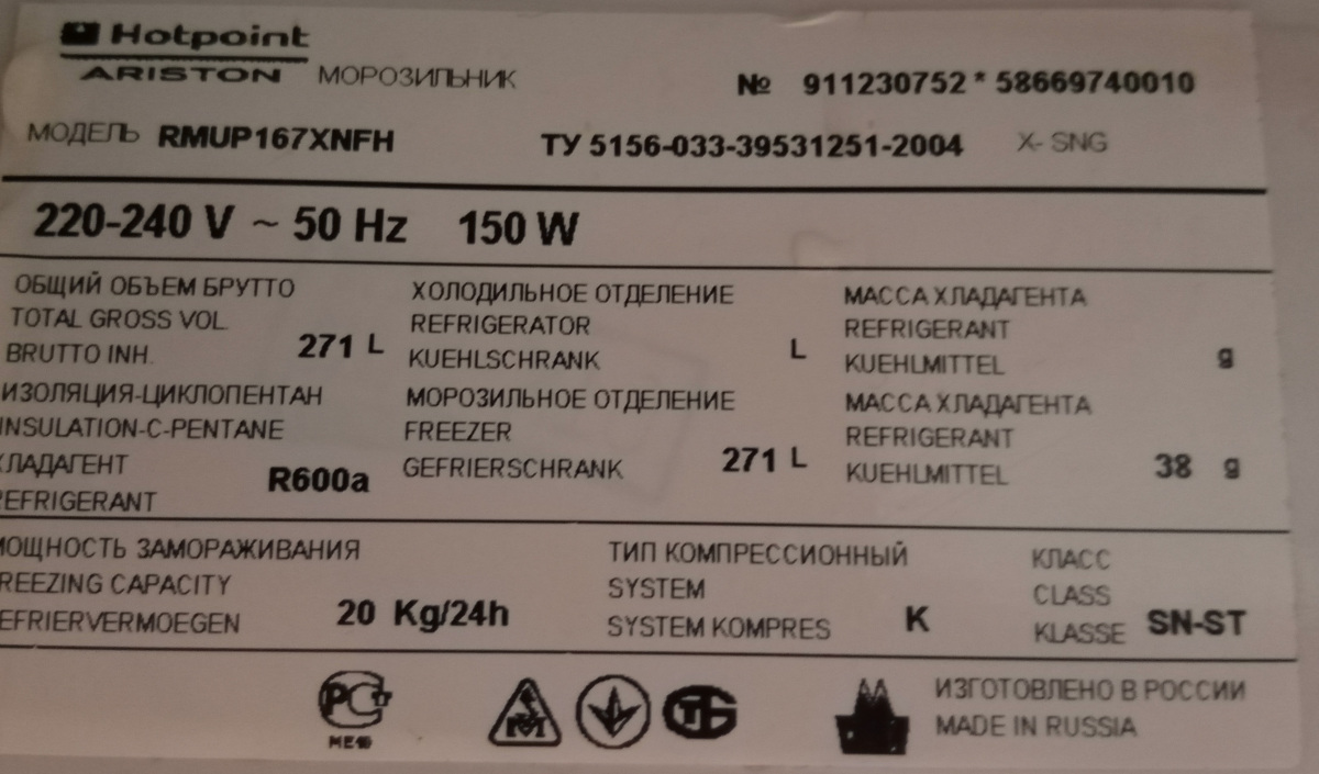 Внутреннее пространство морозильной камеры Hotpoint-Ariston RMUP 167 XNFH делится на 6 отсеков, охлаждаемых по технологии «No Frost». Поэтому для данной модели не требуется разморозка, а температура равномерно устанавливается во всех отсеках. В состав холодильного агрегата входит: компрессор, конденсатор, испаритель, фильтр-осушитель, капиллярный трубопровод, К плюсам конструкции можно вынесенный, не запененный конденсатор, отсутствие запененных участков трубопровода низкого давления, что исключает дефекты – утечки в запененной части, трудоемкие и сложные при диагностике и ремонте. К минусам – стальной контур подогрева периметра двери - наиболее вероятное возникновение утечек после 5 лет эксплуатации на участке трубопровода.